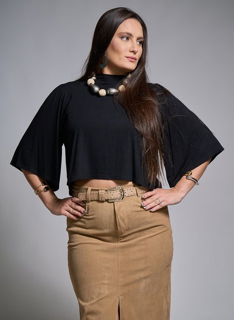 Confeccionada em malha de alta qualidade, oferece caimento confortável e leveza ao vestir. Com manga ampla e gola alta, ela une sofisticação e estilo, criando uma peça que se destaca em qualquer produção. O corte cropped valoriza a silhueta e permite combinações fashionistas e casuais.