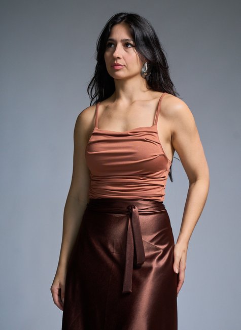 As pregas no busto valorizam a silhueta, enquanto as alças finas proporcionam delicadeza e charme ao visual. Sem fecho na parte inferior, ele mantém conforto absoluto e facilidade ao vestir. Uma peça versátil, ideal para looks casuais, sociais ou sofisticados.