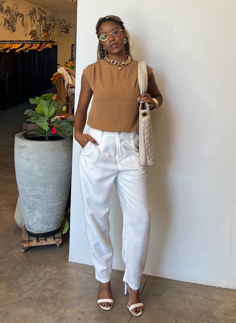 ✨ Noite Sofisticada – Aposte em top acetinado e salto para transformar a alfaiataria em look festa.