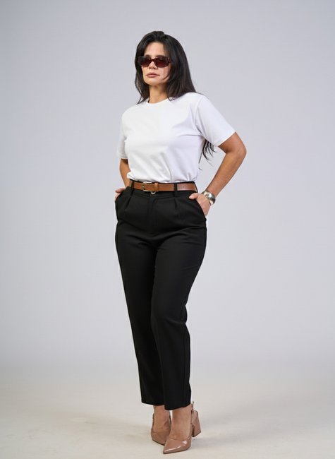 A Calça Milene é a união perfeita entre alfaiataria e feminilidade. Sua modelagem cenoura com pregas frontais valoriza a silhueta, garantindo caimento estruturado e confortável ao mesmo tempo.