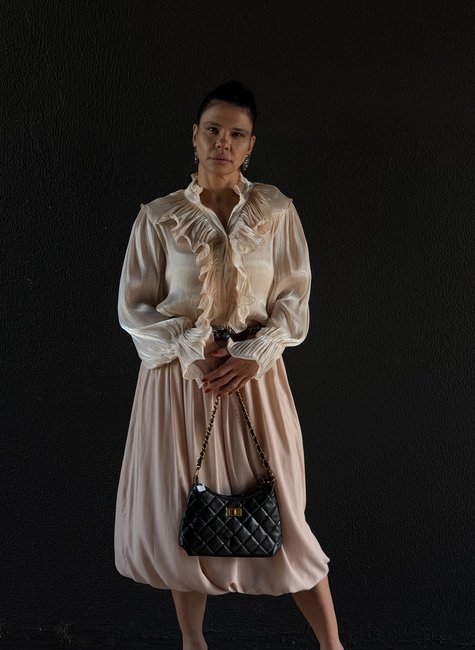 Com babado plissado e pregas delicadas, ela traz movimento e feminilidade ao visual, enquanto o acabamento cintilante adiciona um brilho sutil que eleva qualquer produção.