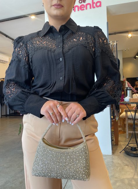 O destaque fica por conta do detalhe em gripir no peito e nas mangas, que acrescenta textura, charme e um toque romântico à peça.