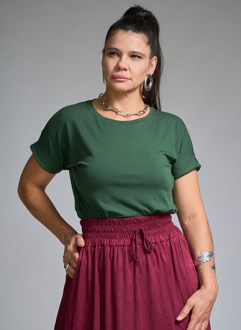 A Camiseta Bella é aquele essencial indispensável no guarda-roupa. Confeccionada em viscolycra macia e confortável, ela oferece toque suave, ótimo caimento e liberdade de movimento. A gola redonda clássica garante versatilidade, enquanto a dobra na manga traz um charme extra e acabamento moderno, elevando o visual mesmo nas produções mais básicas.