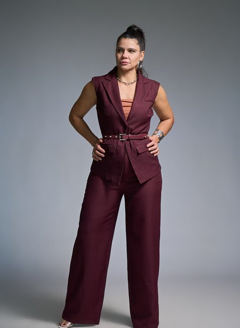 O Conjunto Maria é a definição de sofisticação prática. Composto por calça pantalona de caimento elegante, com bolso faca funcional, e colete alongado, que traz bolso falso e acompanha cinto, ele cria um visual alinhado, atual e extremamente estiloso. É aquele conjunto que imprime presença, valoriza a silhueta e entrega um look completo sem esforço.