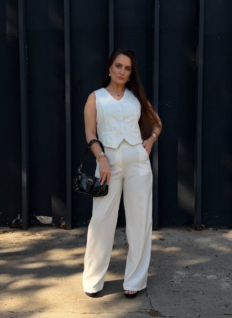 A calça pantalona alonga a silhueta, enquanto o colete curto valoriza a cintura e cria um visual contemporâneo e equilibrado. Ideal para eventos, reuniões ou para quem quer compor um look urbano e chique, sem abrir mão do conforto.