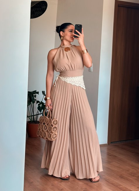 O Macacão Alicia é a escolha perfeita para quem ama um visual sofisticado e confortável ao mesmo tempo. Feito em crepe fluido, ele apresenta calça plissada que alonga a silhueta e traz movimento encantador a cada passo.