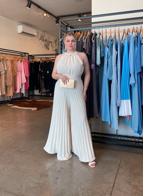 O Macacão Alicia é a escolha perfeita para quem ama um visual sofisticado e confortável ao mesmo tempo. Feito em crepe fluido, ele apresenta calça plissada que alonga a silhueta e traz movimento encantador a cada passo.