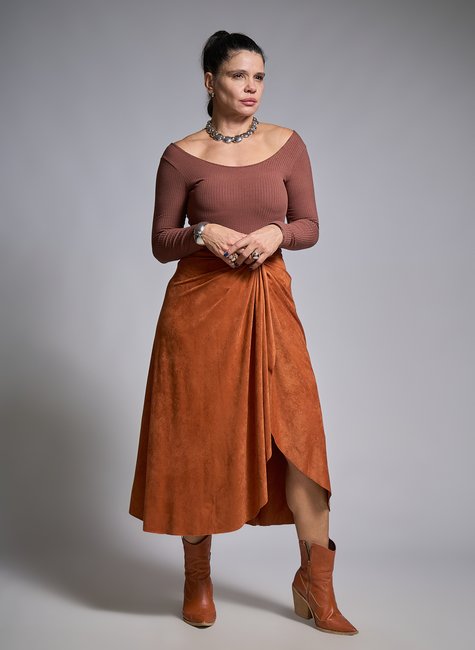 O modelo envelope valoriza a silhueta e cria um visual moderno e feminino, enquanto o comprimento midi garante elegância e versatilidade para diversas ocasiões.