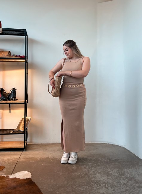 A Saia Longa Michele é a união perfeita entre estilo e praticidade. Confeccionada em tecido canelado de ótima elasticidade, ela se ajusta ao corpo de forma confortável, valorizando as curvas sem apertar. O destaque fica para a fenda lateral, que traz movimento, alonga a silhueta e adiciona um toque sensual na medida certa.
