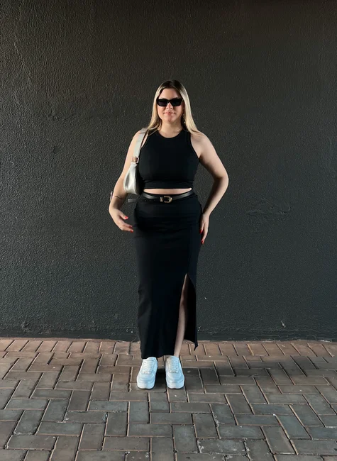 A Saia Longa Michele é a união perfeita entre estilo e praticidade. Confeccionada em tecido canelado de ótima elasticidade, ela se ajusta ao corpo de forma confortável, valorizando as curvas sem apertar. O destaque fica para a fenda lateral, que traz movimento, alonga a silhueta e adiciona um toque sensual na medida certa.