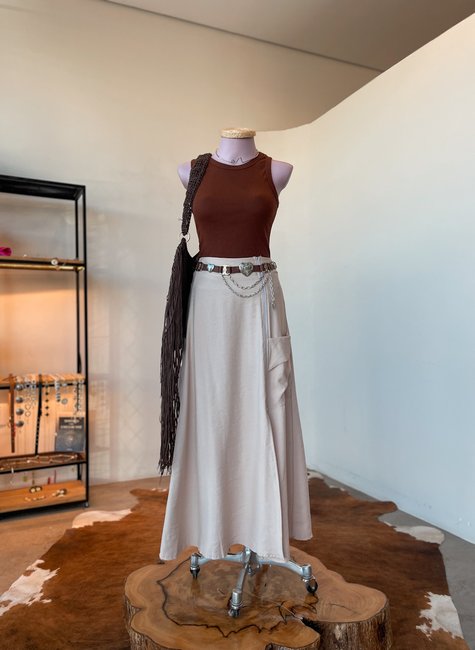 A saia Vick traz um mix perfeito entre funcionalidade e atitude. Com modelagem midi reta, ela ganha destaque pelo bolso utilitário frontal e o zíper tratorado lateral que adicionam um ar moderno e cheio de personalidade à peça. É ideal para quem busca praticidade sem abrir mão do estilo – o shape estruturado valoriza a silhueta, enquanto os detalhes utilitários tornam o look marcante.