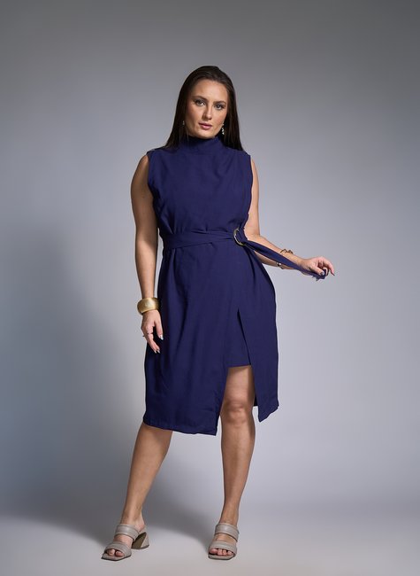 Com gola alta, ele traz um ar elegante e contemporâneo, enquanto o recorte sobreposto adiciona personalidade e um acabamento diferenciado ao design. O cinto faixa com fivela marca a cintura com charme, valorizando a silhueta de forma equilibrada e elegante. Uma peça versátil, ideal para ocasiões que pedem presença e estilo.