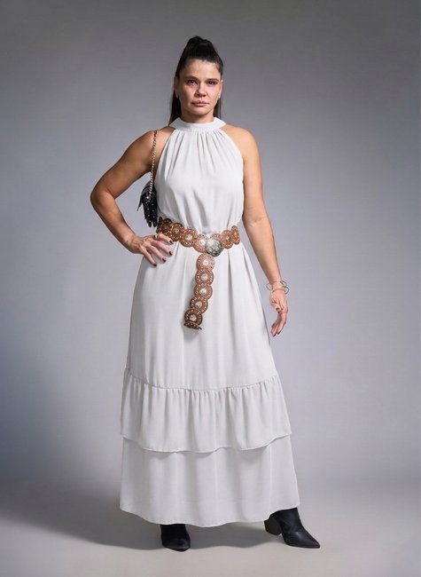 Os babados na barra adicionam movimento e delicadeza, criando um efeito fluido a cada passo. O comprimento longo reforça a elegância da peça, enquanto o caimento leve proporciona conforto e charme na medida certa.